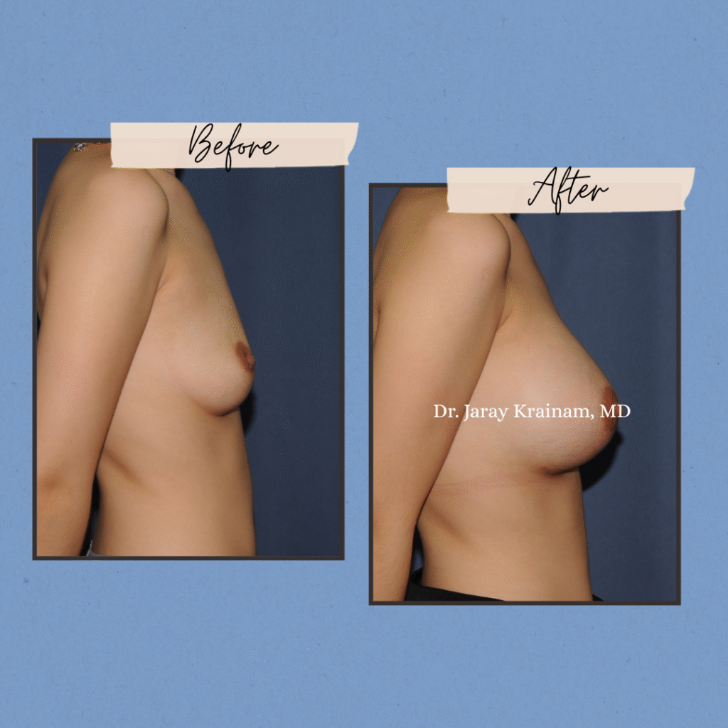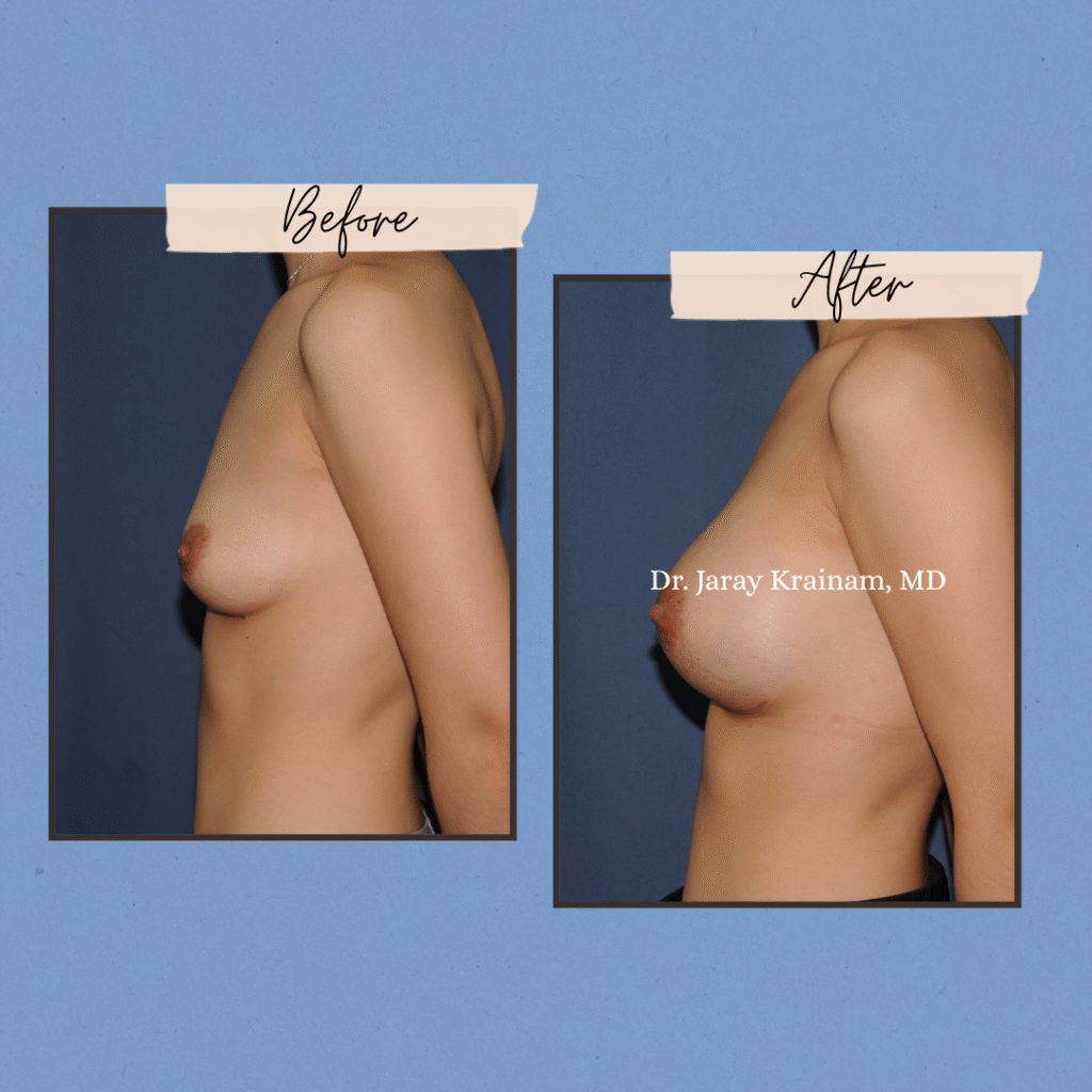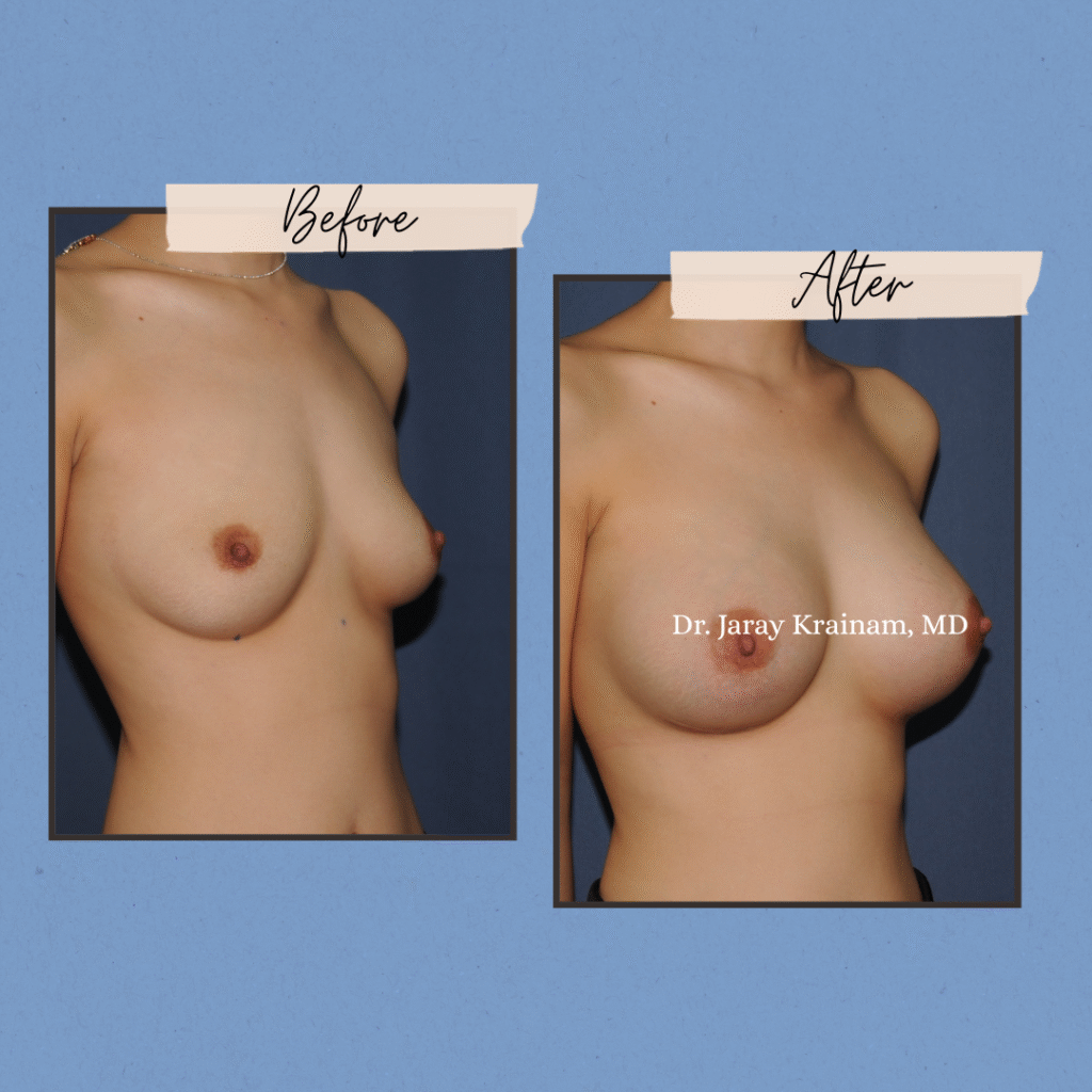 This section presents results of Breast Augmentation for Type 1–1 mild breast sagging, a category where the nipple remains well above the inframammary fold and no breast lift is required. Through expert implant selection, precise placement, and anatomical planning, Dr. Jaray Krainam, MD enhances volume, projection, and upper pole fullness while naturally correcting mild ptosis using implants alone.