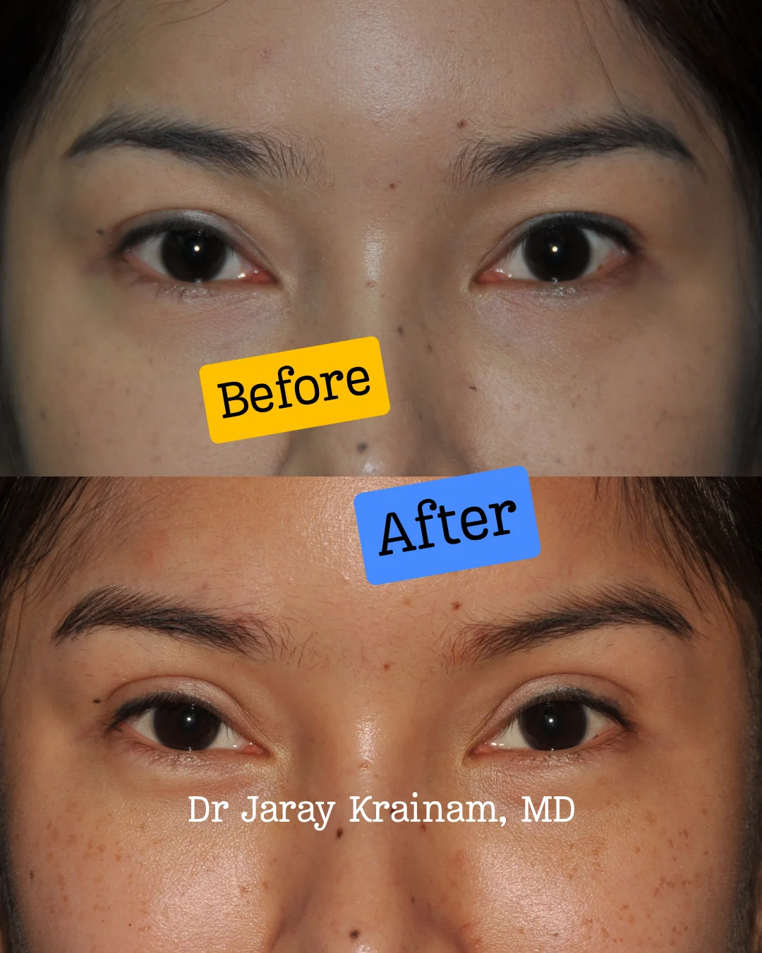 This section presents a corrective case of Upper Eyelid Asymmetry (Complication 1.1) performed by Dr. Jaray Krainam, MD, after an unsatisfactory outcome from surgery done elsewhere. Through advanced revision blepharoplasty techniques, Dr. Jaray precisely restores eyelid balance, enhances crease definition, and improves overall harmony of the upper eyelids. This corrective approach is ideal for patients seeking natural, symmetrical, and long-lasting results following complications from previous eyelid procedures.